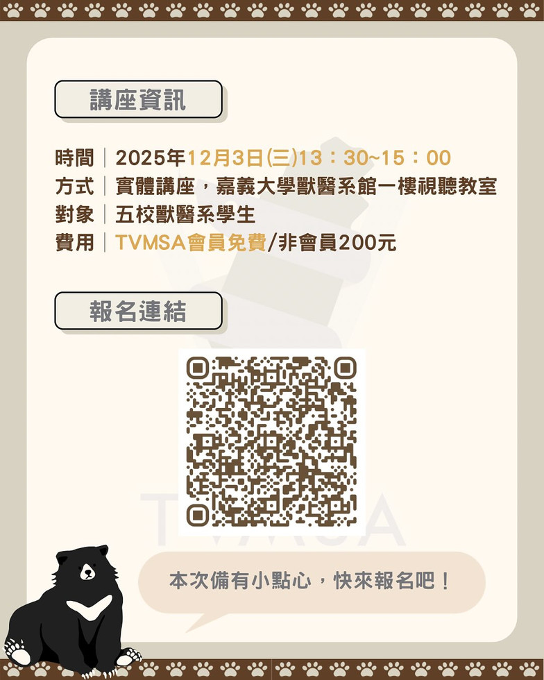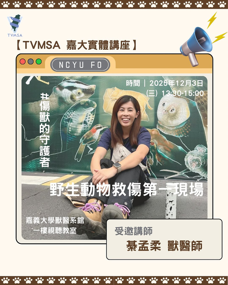 ▍方式:實體講座,嘉義大學獸醫學系 系館一樓視聽教室(現場提供小點心)
