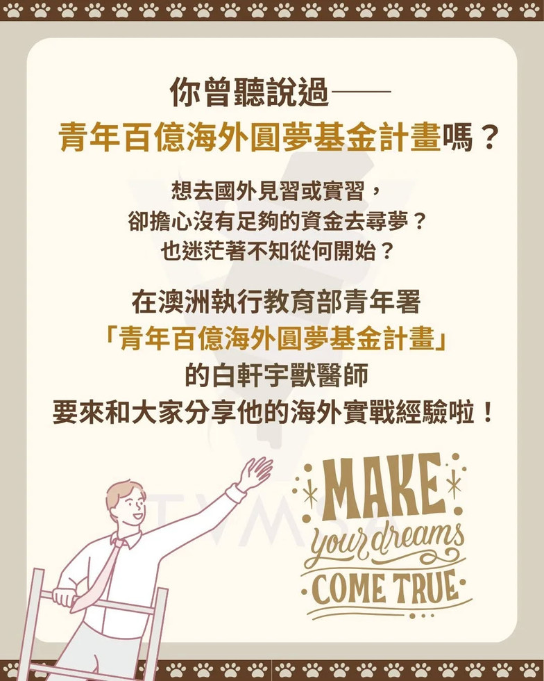 【TVMSA臺大實體講座】青年百億獸醫師之澳洲圓夢行——海外實習經驗分享會